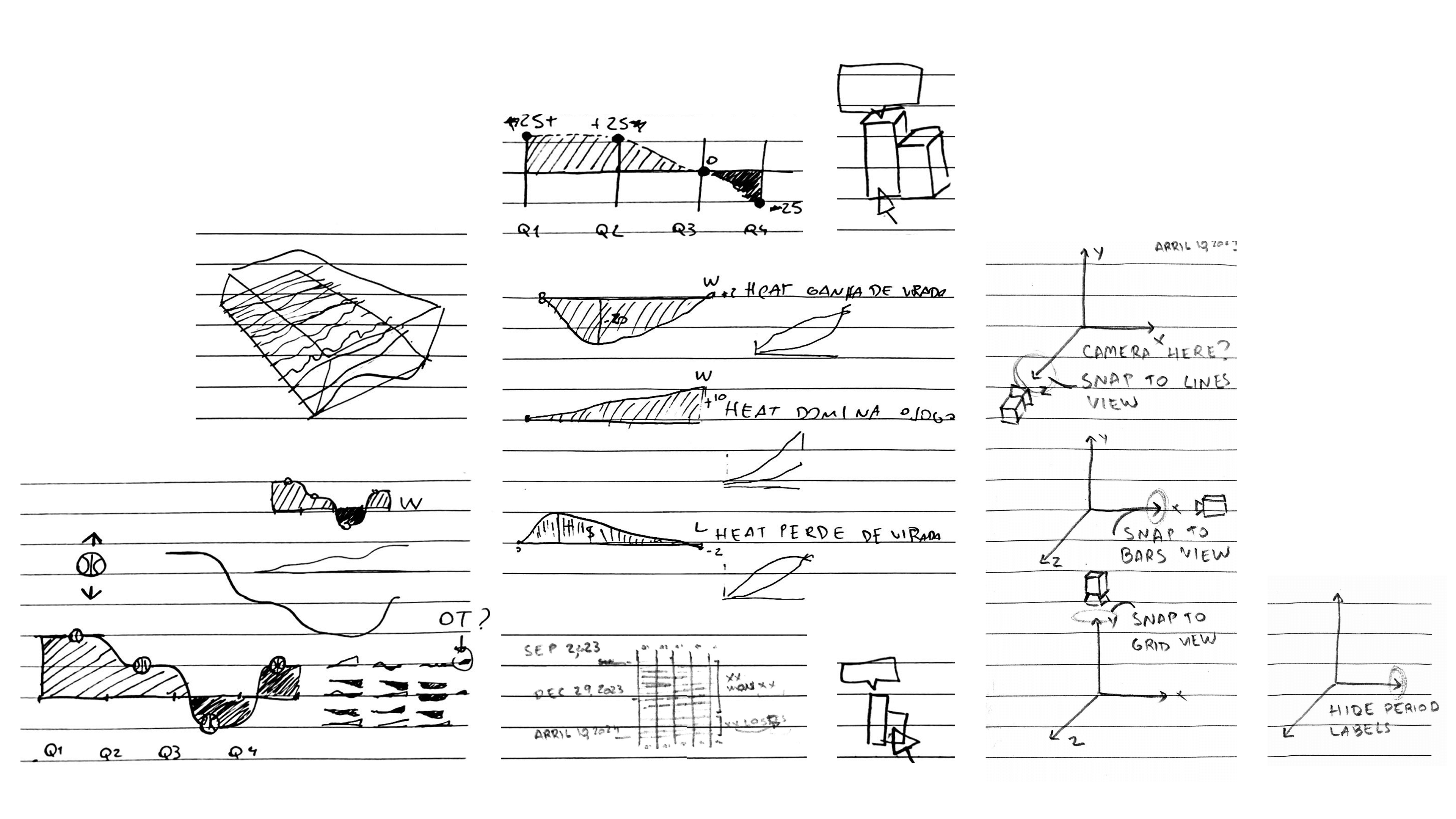 Given the shape of the “terrain” created by those 3D bars, the corners of the screen offered the most precious real estate for interactive widgets. That’s what I embraced.