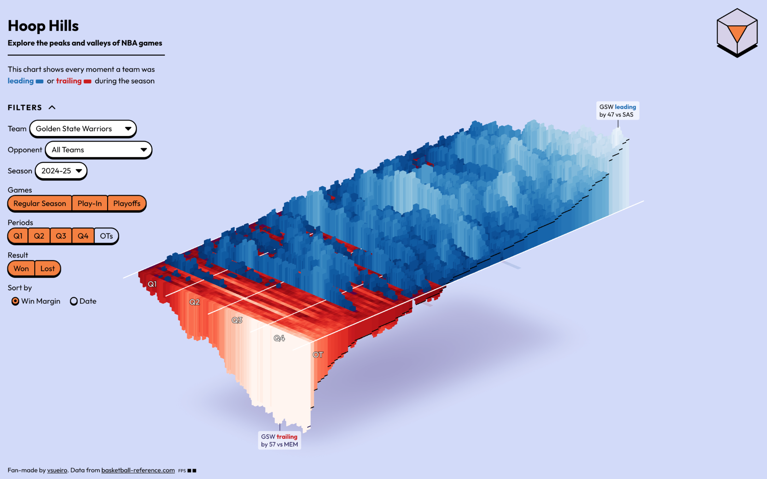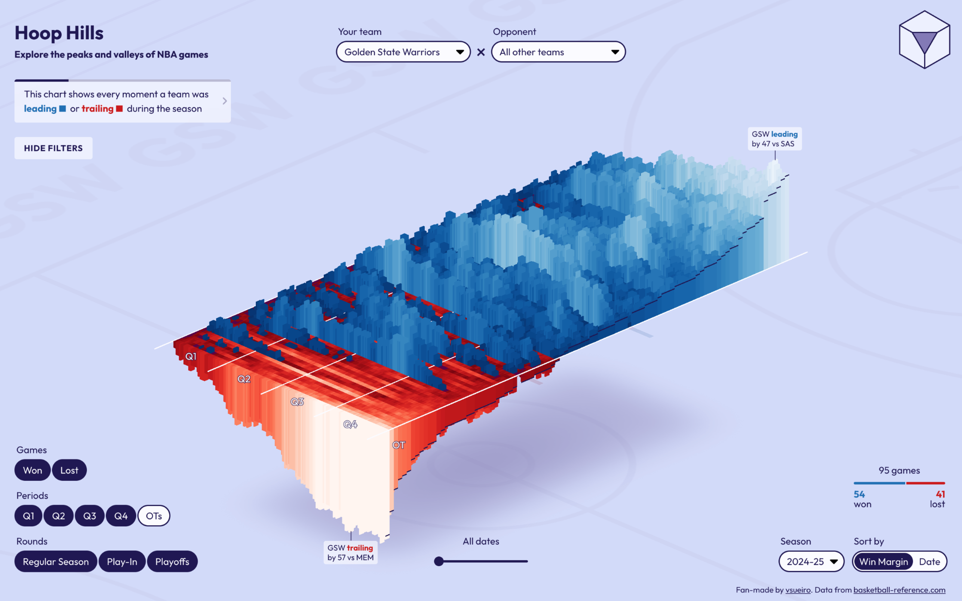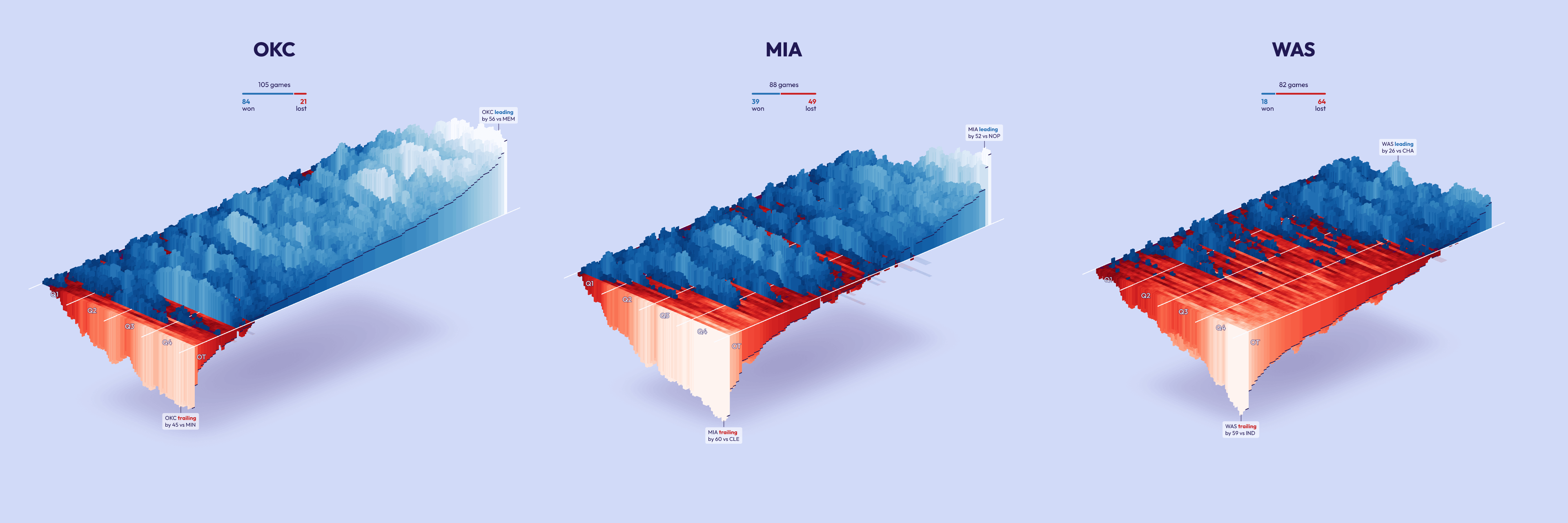 I spent over a year playing with this 3D chart for NBA data. It (ambitiously) shows every moment a team was leading (🟦) or trailing (🟥) during a season.